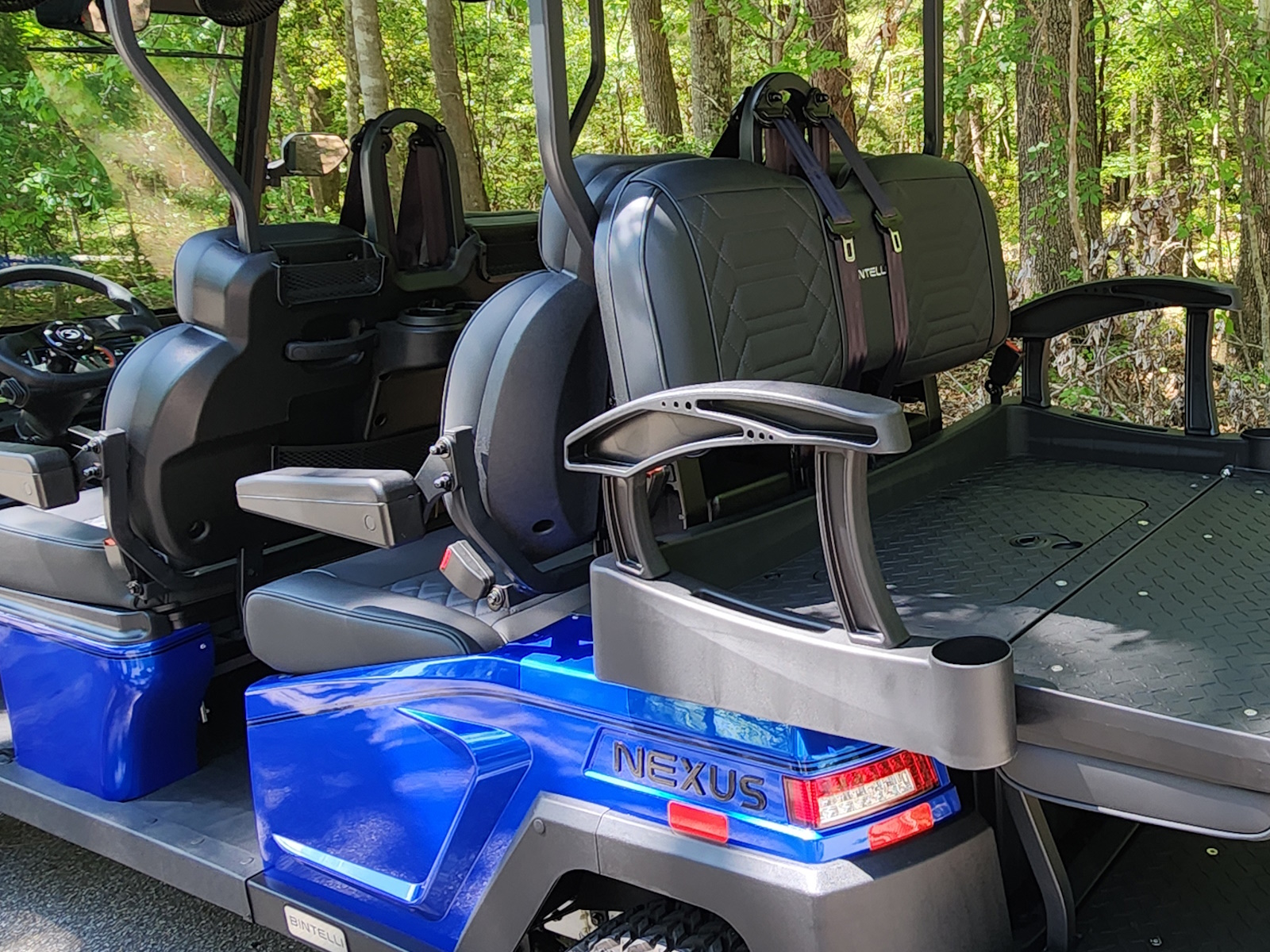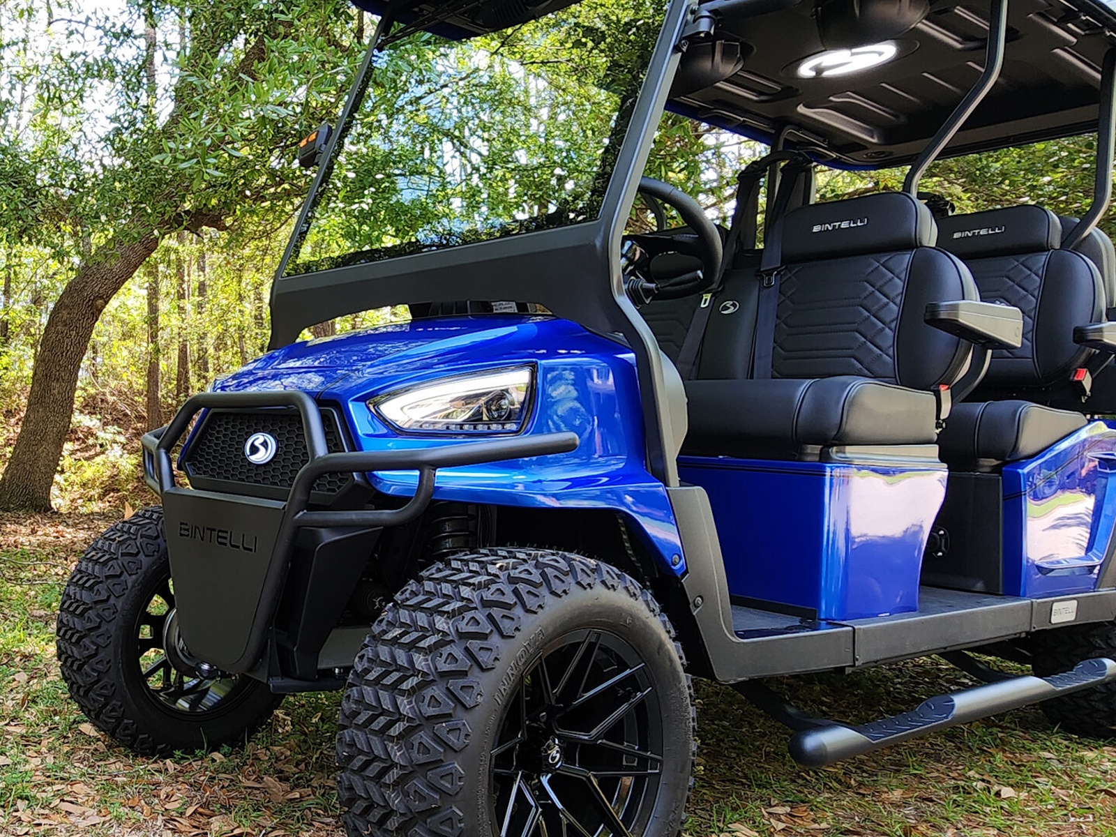 The Nexus is powered by a range-extended 72v drive system and is packed with more standard features than any other cart at its price point. Complete with a 13″ high-res infotainment center, roof-mounted fans, lights, and speakers, a beach chair holder, LED accent lighting, and lockable storage. The Gen2 adds power steering, adjustable camber, color-changing under mounted lights, push-button start, and so much more… be prepared to be the talk of your neighborhood with the all-new Bintelli Nexus!