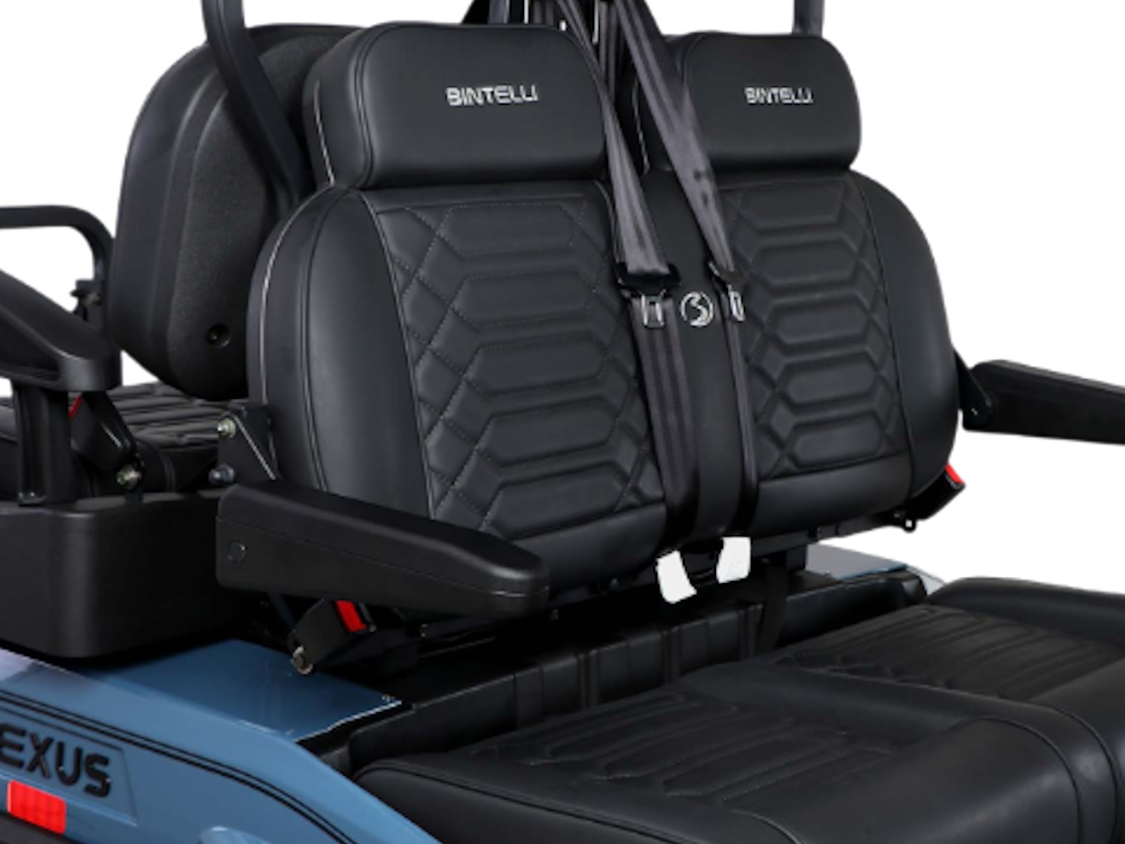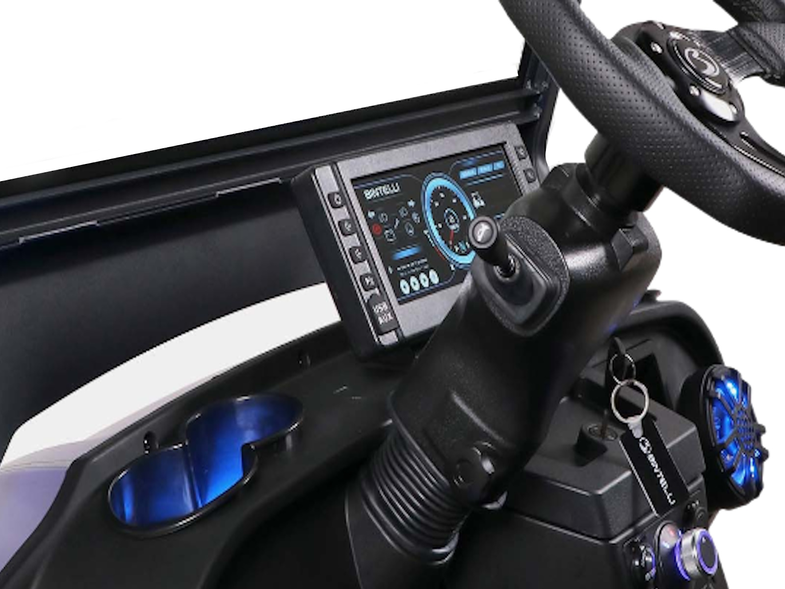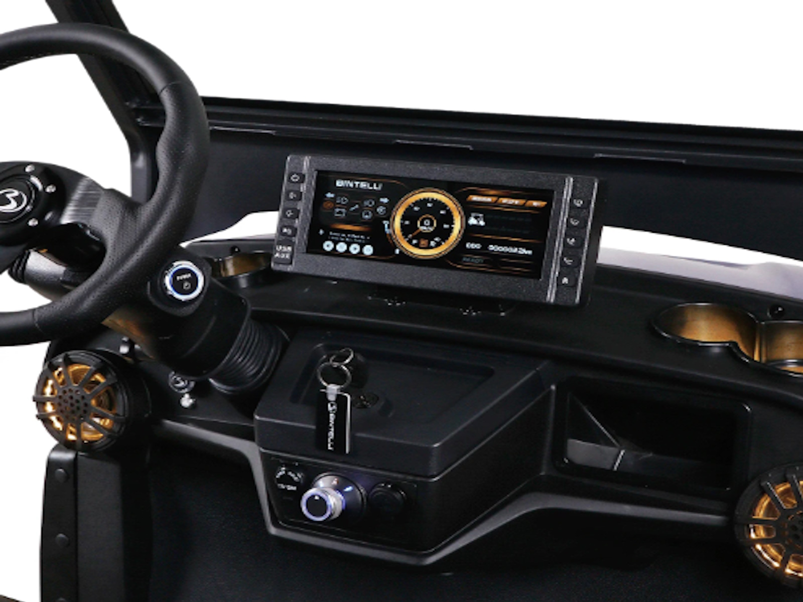 The Nexus is powered by a range-extended 72v drive system and is packed with more standard features than any other cart at its price point. Complete with a 13″ high-res infotainment center, roof-mounted fans, lights, and speakers, a beach chair holder, LED accent lighting, and lockable storage. The Gen2 adds power steering, adjustable camber, color-changing under mounted lights, push-button start, and so much more… be prepared to be the talk of your neighborhood with the all-new Bintelli Nexus!